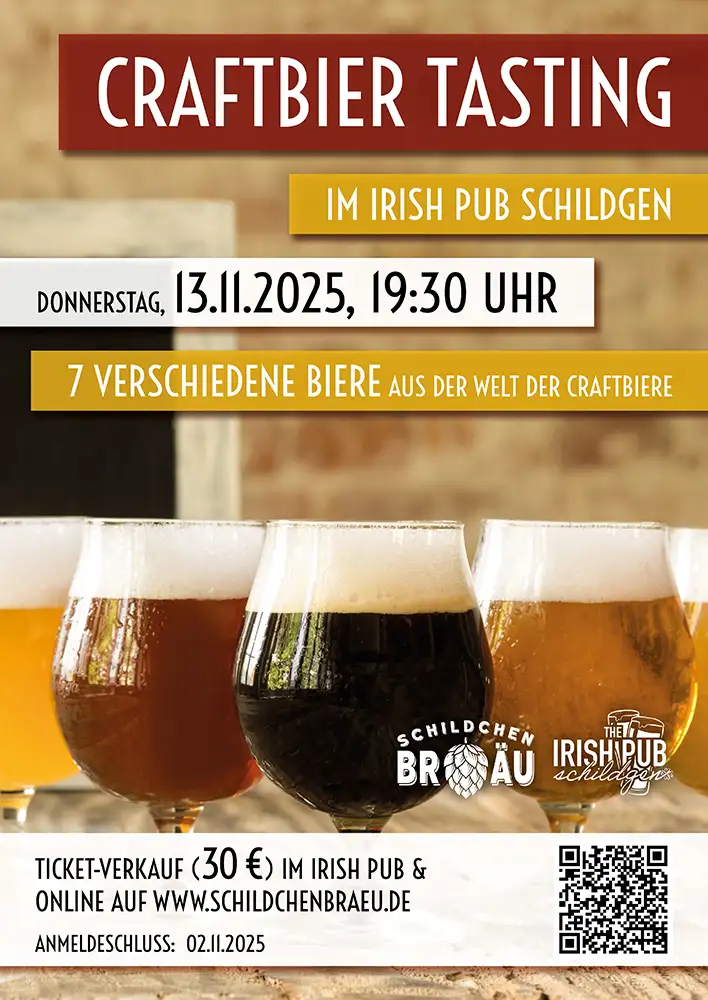 Am Donnerstag, den 13. November 2025 laden der Irish Pub Schildgen und ich euch herzlich zu unserem nächsten Biertasting ein. Meldet euch am besten direkt an und sichert euch euren Platz!