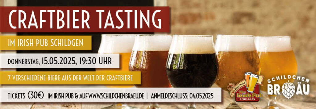 Meldet euch jetzt für unser nächstes Biertasting an und freut euch auf einen gemütlichen Abend voller gutem Craftbeer – am 15.05.2025 im Irish Pub Schildgen.