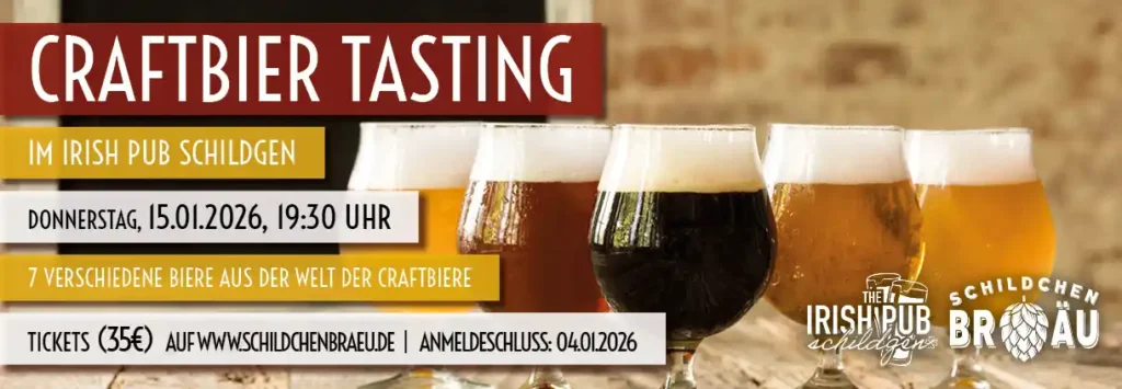 Unser ersten Craftbier-Tastings im Irish Pub Schildgen finden am 15.01.2026 und 12.03.2026 statt. Auch perfekt als bieriges Weihnachtsgeschenk geeignet. Jetzt anmelden!
