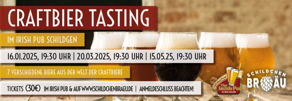 Jetzt online für die ersten Biertastings im neuen Jahr im Irish Pub Schildgen anmelden. Freut Euch auf einen gemütlichen Abend mit sieben abwechslungsreichen Craftbieren. Termine: 16.01.2025 | 20.03.2025 | 15.05.2025